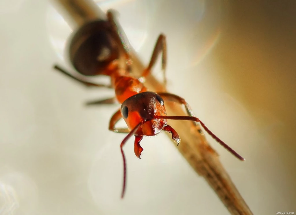 На картине изображено насекомое, которое можно идентифицировать как муравей. Он имеет характерный красновато-коричневый цвет с меньшей, более темной головой и антеннами. Это изображение фиксирует детали лица муравья и антенн, которые являются типичными особенностями, используемыми для идентификации различных видов в семействе муравьев.