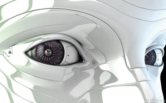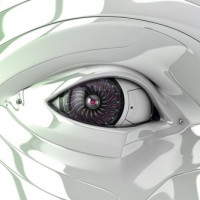 mechanical parts. It is a close-up view of the robot's face, focusing on the eye and part of the head. The background is black, which emphasizes
