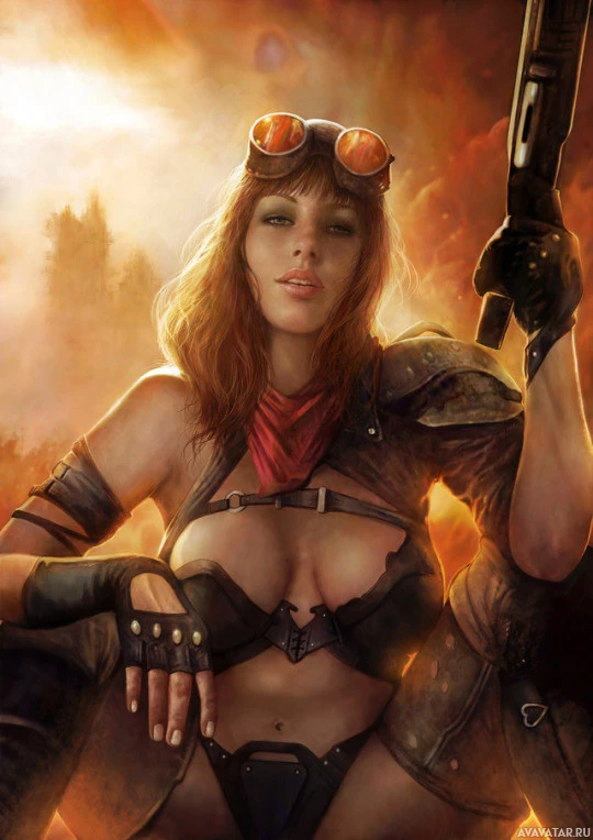 a female character who appears to be part of a video game, film, or illustration. She is seated and holding a weapon. Her attire includes what seems to be a protective vest with