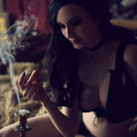 wearing lingerie and a choker with what appears to be a gothic or dark fantasy theme. She is holding a cigarette and seems to be smoking it. Her expression is contemplative or perhaps sad, looking away from the viewer. The background suggests an opulent interior, possibly designed for a character in
