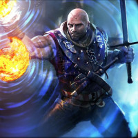 the fiery energy emanating from his hand. The character is surrounded by magical effects that suggest he is performing some kind of