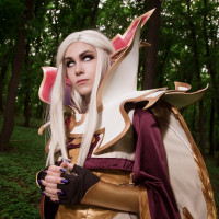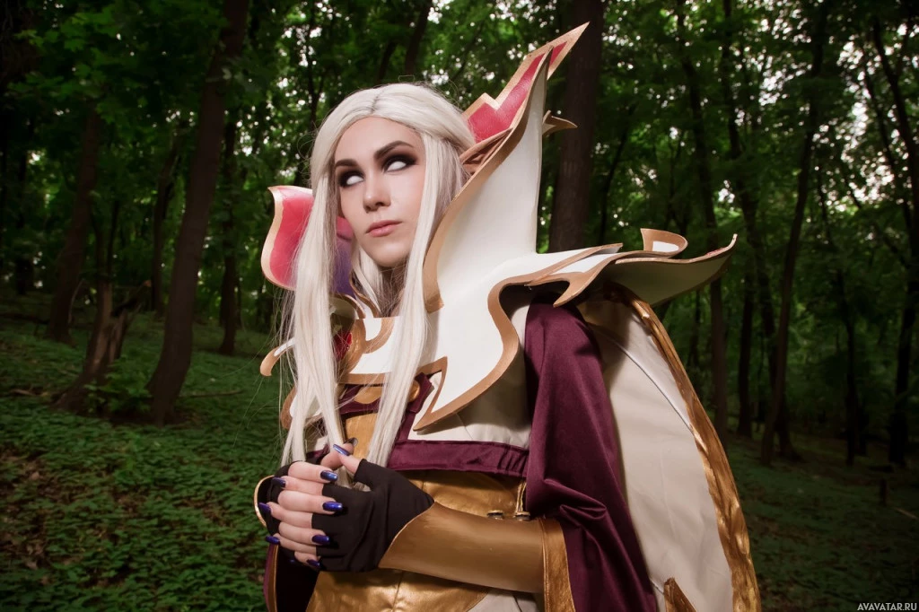blonde hair and is wearing a fantasy-style outfit that includes intricate armor elements and accessories. They have an ethereal or otherworldly appearance, with their makeup enhancing this effect. The background suggests they are in