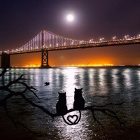 a full moon illuminating the sky and casting light on the water below, which appears to be the San Francisco Bay, given the distinctive shape of the bridges that resemble those found in the city. The foreground is darker, creating