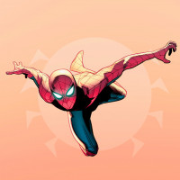 The image features a character known as Spider-Man. He is depicted in his iconic blue and red suit, with the distinctive spider emblem on his chest, web shooters on his wrists, and