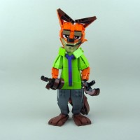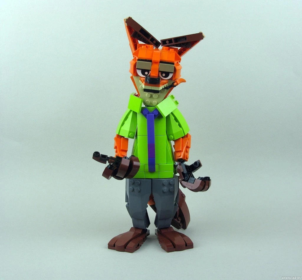 На картинке изображена фигура Lego, которая призвана напоминать лису. Фигура имеет типичную красно-белую окраску лисы, с характерными ушными структурами на голове. На нем зеленая рубашка с синим галстуком и серыми штанами. В правой руке он держит предмет, похожий на маленькую гитару или банджо. Эта фигура LEGO, вероятно, является частью тематического набора, основанного на персонажах из популярной культуры.