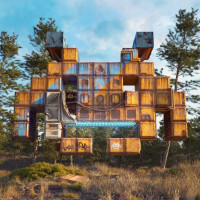 video games. The design is made up of various shipping containers and other industrial materials, assembled in such a way that it gives the impression of a three-dimensional figure that could be from
