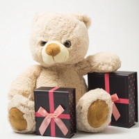 The image shows a teddy bear holding two gift boxes with pink ribbons. The setting appears to be a plain background, likely for the purpose of presenting these items as gifts or presents.