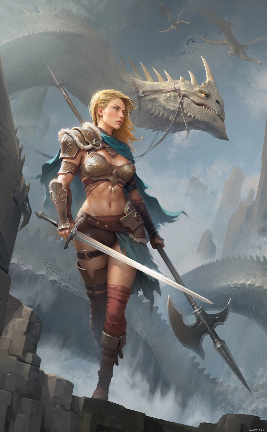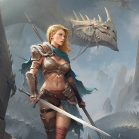 a rocky outcrop with a dramatic landscape behind her. A dragon is also present in the background, its head rising above the rocks, suggesting a confrontation or a scene from