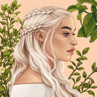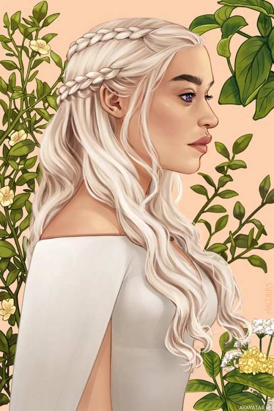 На картинке изображен персонаж, который выглядит как Дейенерис Таргариен из телесериала «Игра престолов». Она изображена с безмятежным выражением, смотрящим в одну сторону. Фон включает пышные зеленые листья и желтые цветы, предлагая идиллическую естественную обстановку.