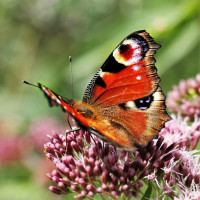 The image shows a butterfly perched on a cluster of purple flowers. The butterfly appears to be in focus, with its wings spread out and showing the characteristic colorful patterns that are typical of this type of insect.