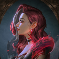 a tear drop on her chest, which could imply some sort of emotion or mystical element associated with her character. The background is minimalistic and dark-toned, enhancing the dramatic and possibly