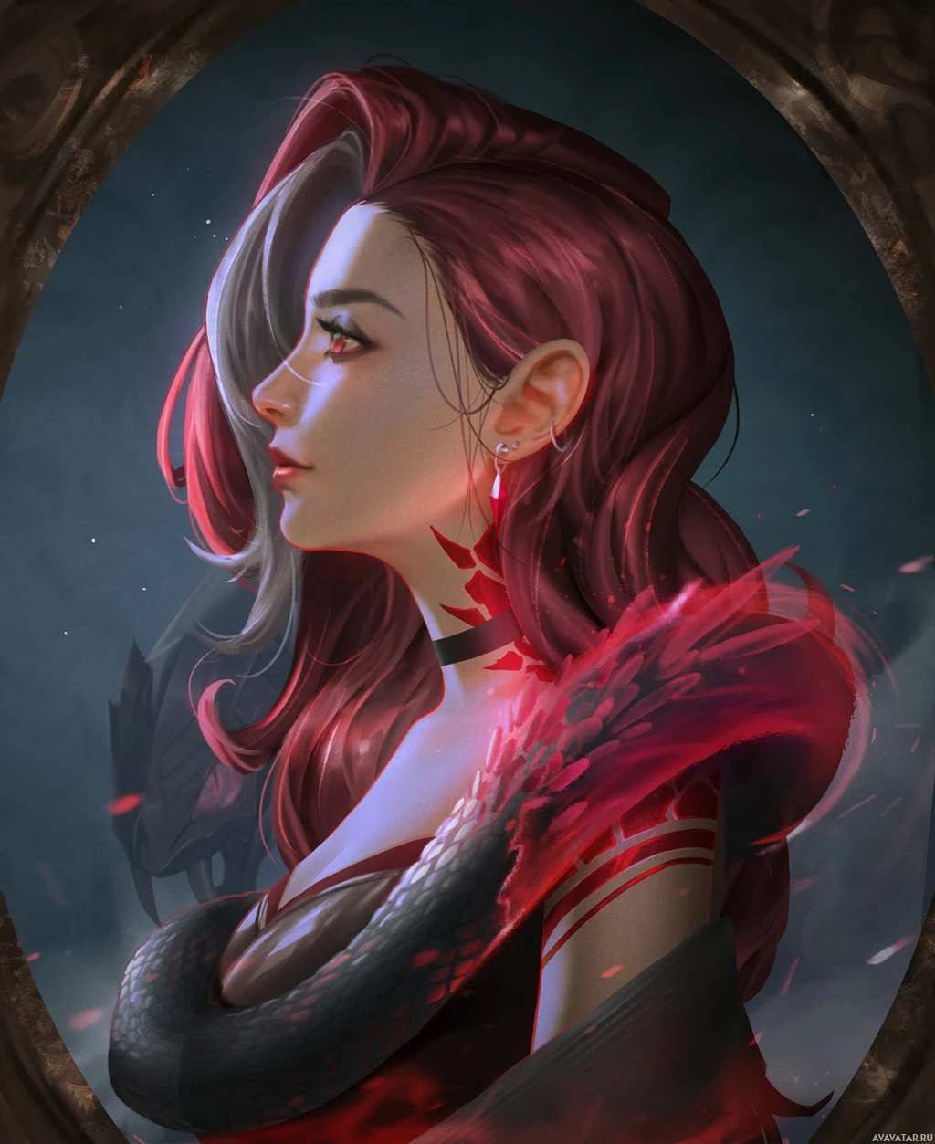 a young woman with red hair. She has a serious expression and is wearing what seems to be a dark or black outfit, possibly a leather corset or garment, suggesting she might be a part of