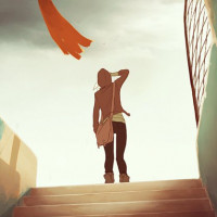 a set of stairs. The individual is facing away from the viewer, and appears to be looking out over what might be an urban or industrial environment. There are several orange banners hanging across the scene that add a vibrant