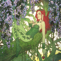 red hair and is shown sitting on a tree branch, which has blossomed with flowers. Her attire appears to be nature-themed, suggesting she may have a connection to nature or