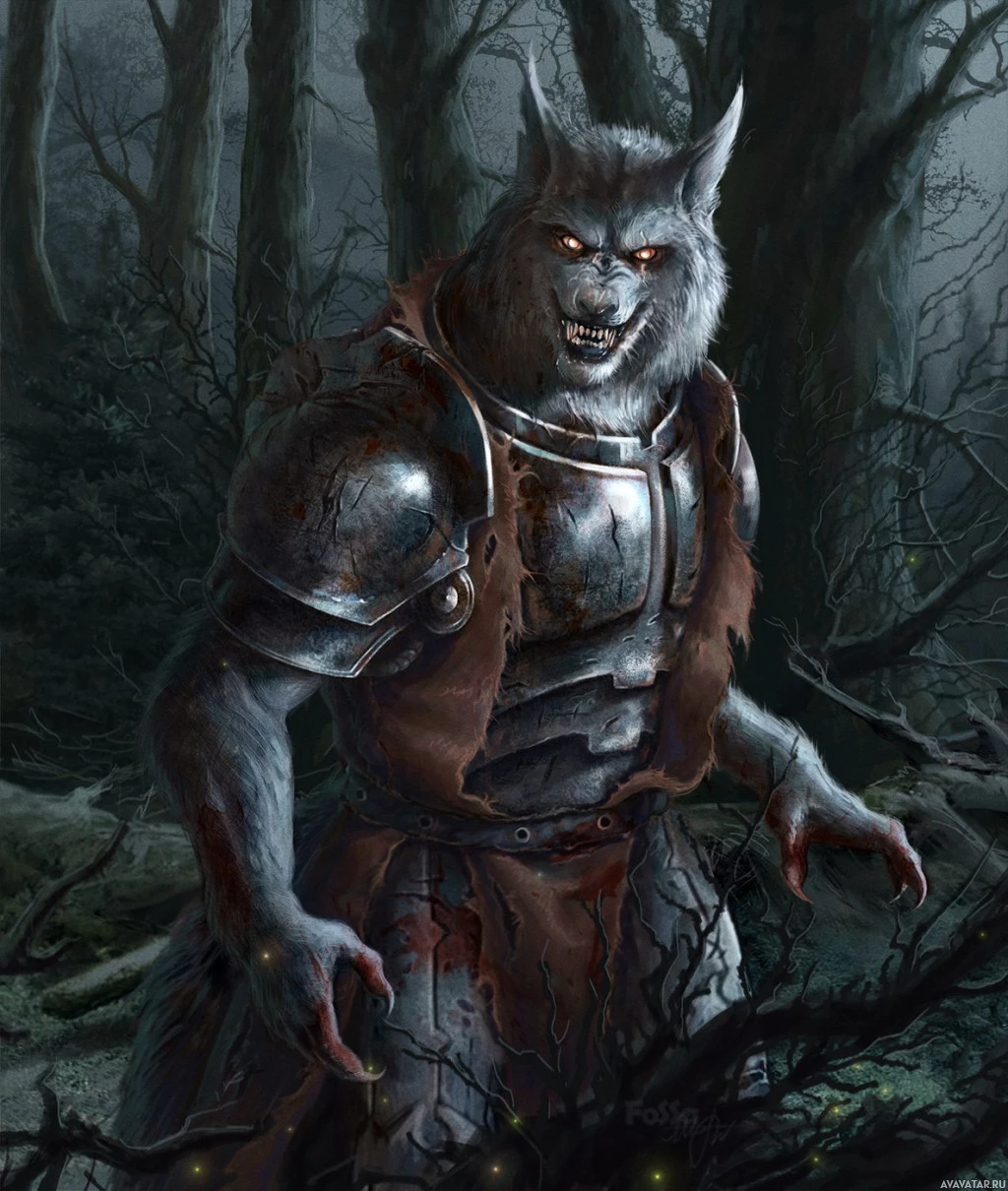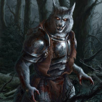 open mouth. The werewolf is depicted wearing armor and has a somewhat humanoid posture, adding to the mythical or