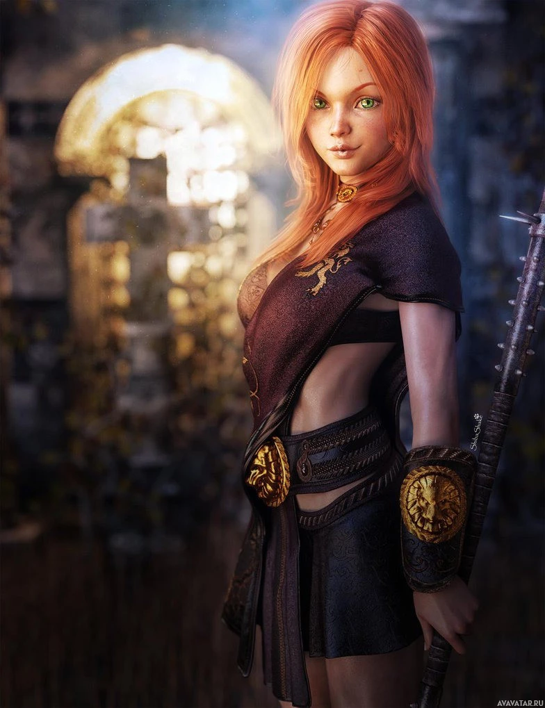 a female character with red hair. She is dressed in what appears to be a fantasy or ancient-themed outfit, consisting of a brown top with