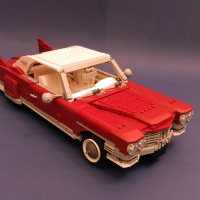 На снимке изображена модель автомобиля Lego. Он спроектирован так, чтобы выглядеть как старинный или классический спортивный автомобиль, с красным кузовом и черной крышей. Есть такие детали, как фары, колеса и, возможно, другие аксессуары, которые типичны для моделей автомобилей Lego.