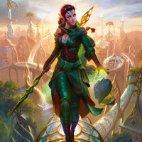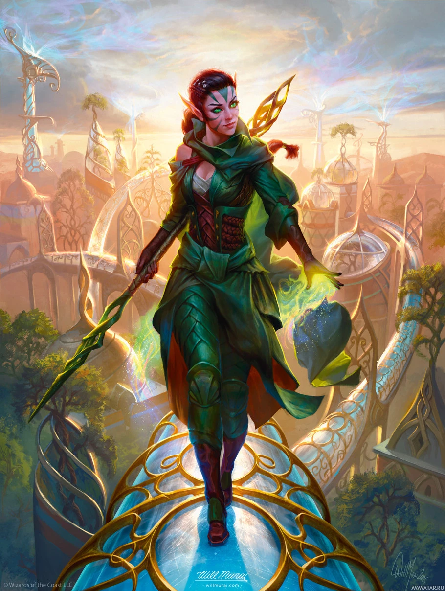 a fantasy scene featuring an elf character. The elf has vibrant