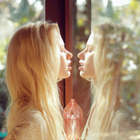 The image shows a woman looking at her own reflection in a mirror. She has blonde hair and appears to be indoors, possibly near some windows or doors that are letting in light. The woman is wearing what seems to be a patterned top or dress. There's nothing else visible in the picture; it focuses on this intimate moment of self-reflection.