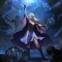 blue energy emanating from her hand. Surrounding her are various creatures and figures that suggest she might be in a battle or confrontation scenario typical of