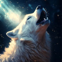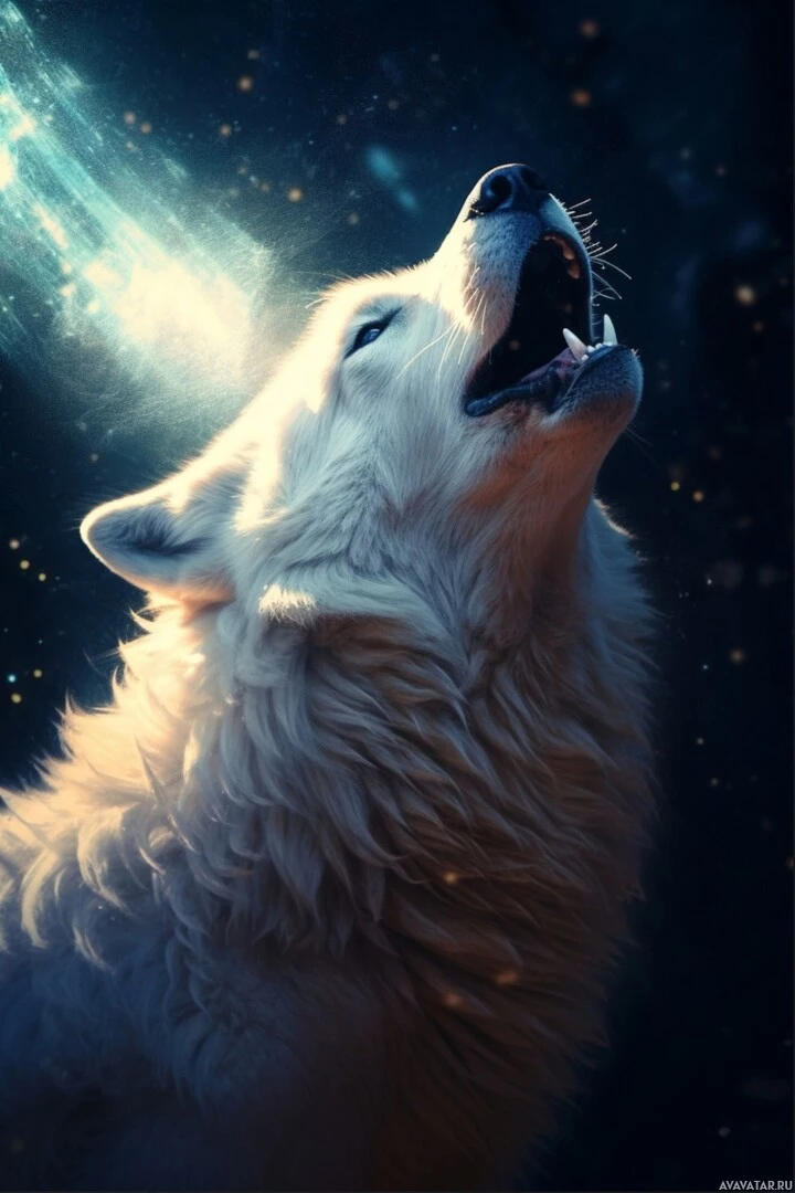 a cosmic background. The wolf is depicted with