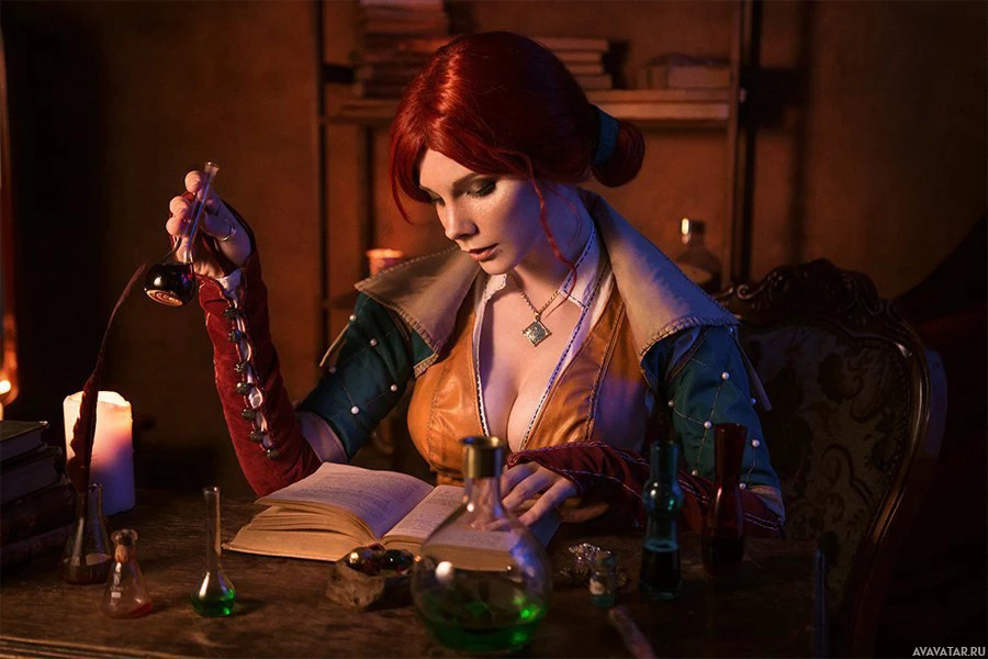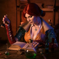 a glass container filled with a substance that could be potion or liquid, and several books scattered about. This character is likely Triss Merigold from