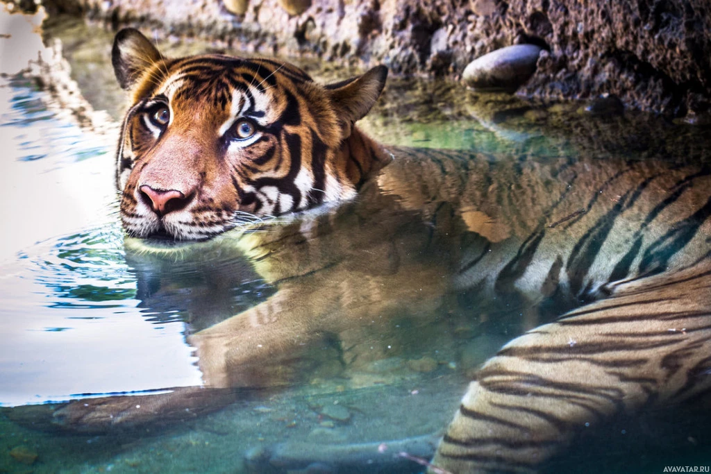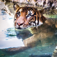 a life jacket, which is not a natural occurrence for a tiger as they do not typically require such assistance while swimming. This suggests that the photo may have been taken at a facility where animals are provided with additional