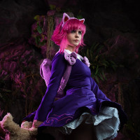 the video game "League of Legends." They are dressed in an outfit that resembles the design of one of the characters from the game, which is known for its fantasy and mythology themes. The costume includes