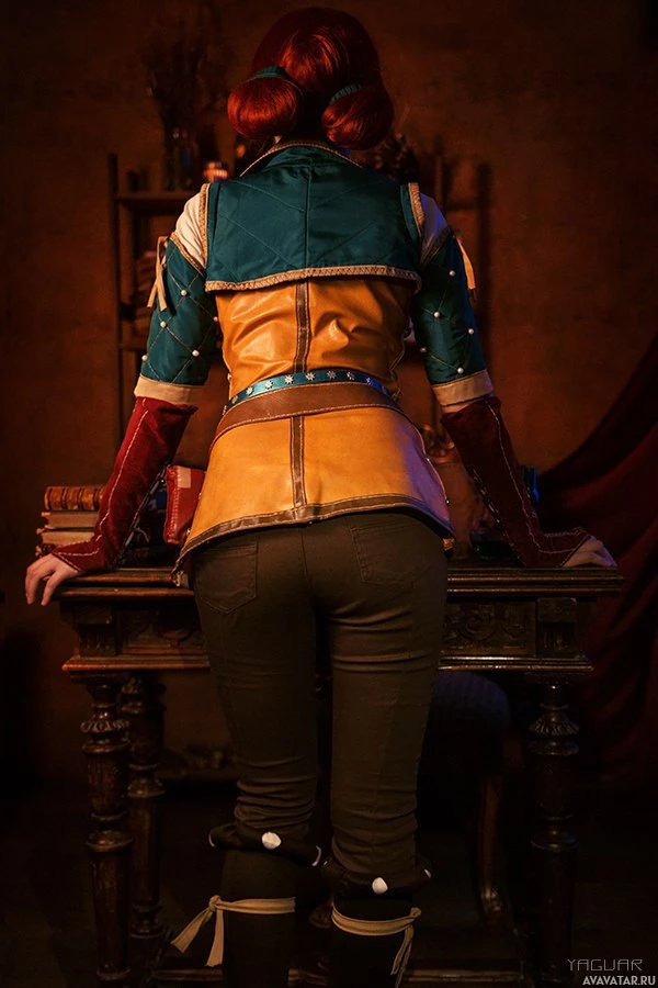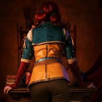 Triss Merigold, portrayed by actress Anna Shaffer in the live-action adaptation of the series. She is dressed in costume that reflects her character's outfit in the game, featuring a corset and leather elements. The setting appears to be an office or workspace, which adds to the context of the scene.