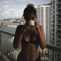 The picture shows a woman wearing a black swimsuit. She is standing on a balcony with a view of the ocean and city skyline in the background. She appears to be enjoying a coffee while looking out at the scenery. There are no cups visible in the image, but she might have one out of frame.