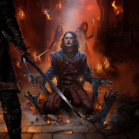 a moody atmosphere, and there's what looks like fire or smoke in the background, adding to the intensity of the scene. The attire and props suggest a medieval or fantasy theme.