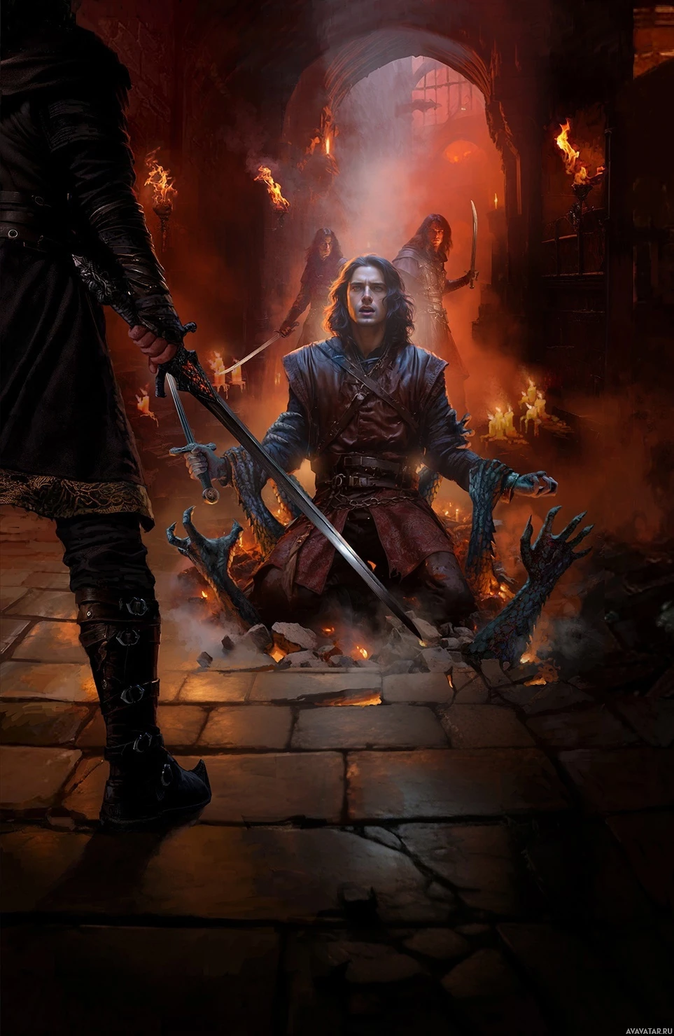 a fantasy narrative. There are two men, one standing and the other kneeling on the ground. They seem to be engaged in a confrontation or conversation. Both characters are holding swords, suggesting they could be warriors or knights. The setting is dramatic, with dim lighting that gives it