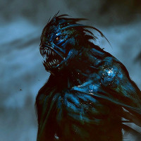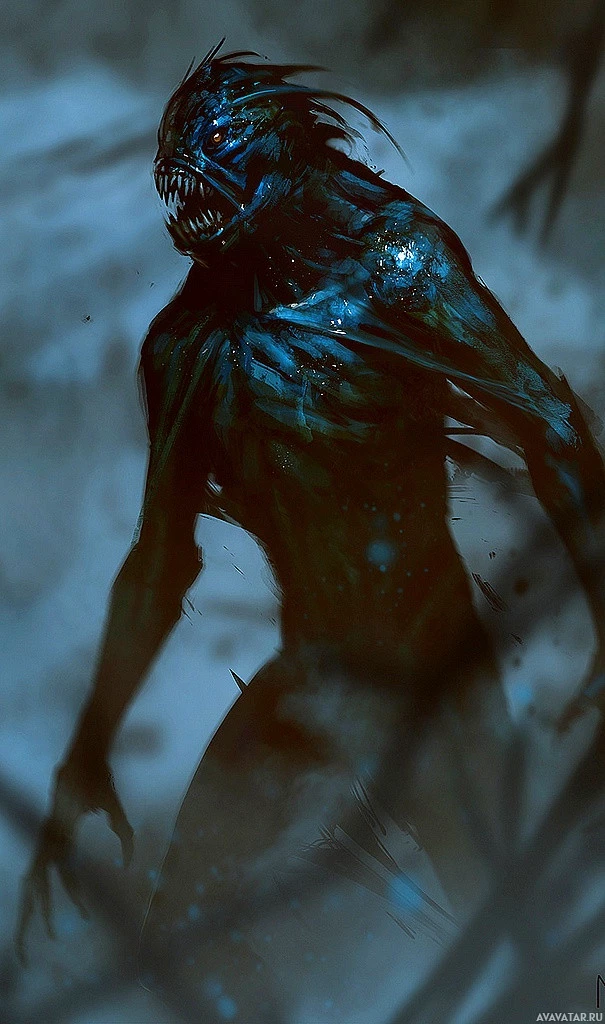 The image depicts a fantasy horror creature that appears to be a humanoid with exaggerated features, such as an elongated jaw and