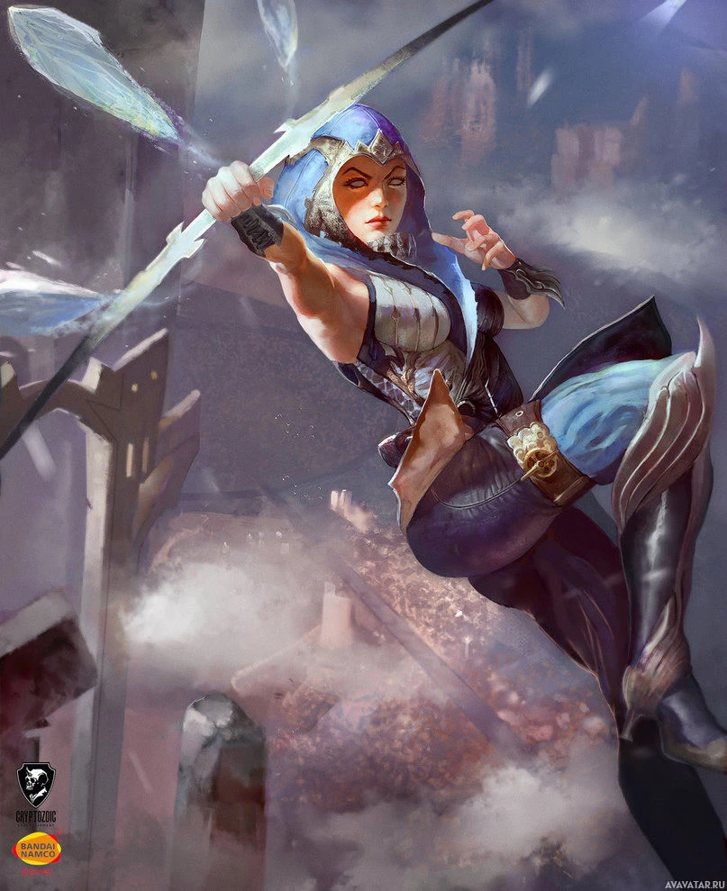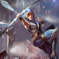 a female warrior or archer. She is holding a bow and has one hand raised as if she's either aiming the arrow or casting a spell. Her attire suggests