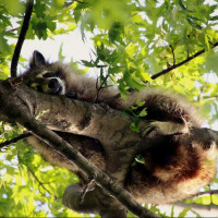 The image shows a raccoon in a tree. It appears to be resting or possibly grooming, given its relaxed posture with one paw on the branch. The surrounding environment suggests it's daytime with bright sunlight filtering through the leaves of the tree.