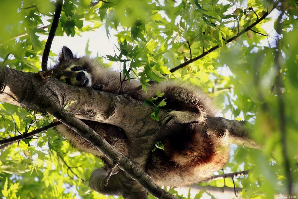 Картинка показывает енота на дереве. Похоже, что он отдыхает или, возможно, ухаживает, учитывая его расслабленную позу с одной лапой на ветке. Окружающая среда предполагает, что это дневное время с ярким солнечным светом, фильтрующим листья дерева.