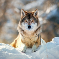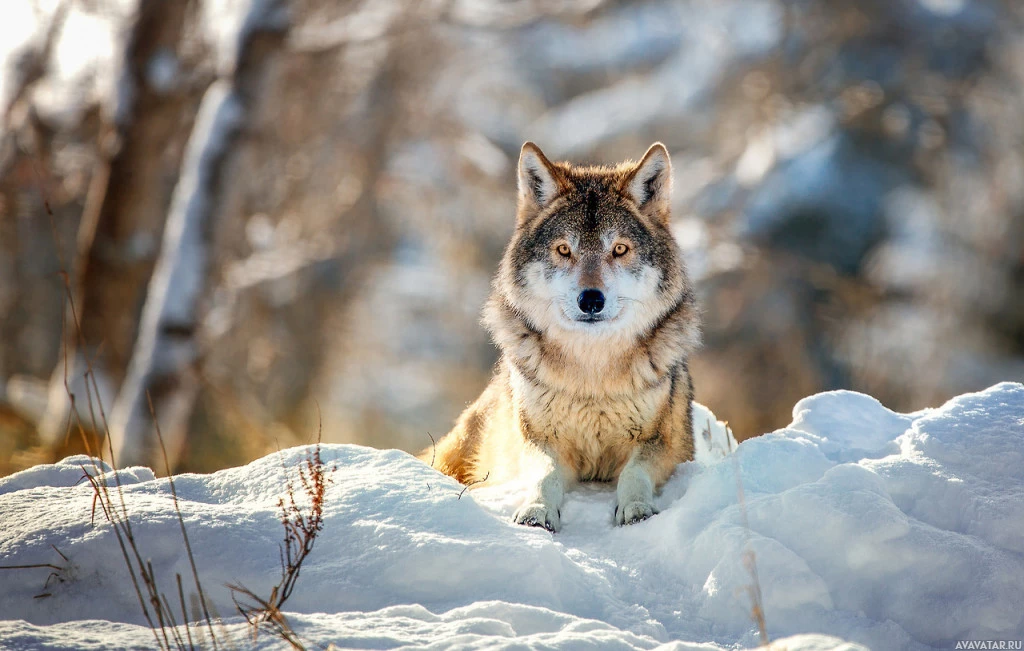 The image shows a wolf sitting in the snow. The wolf has a prominent facial structure with erect ears and