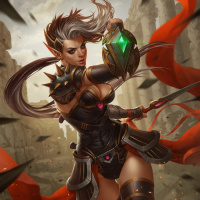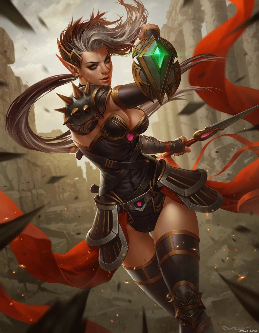 an elf warrior. She is wearing armor with fantasy elements, such as leather and metal components, along with what seems to be a cape or cloak. Her hair is styled in a way that suggests motion, giving the impression she might be in mid-swing. The setting looks like a rocky or