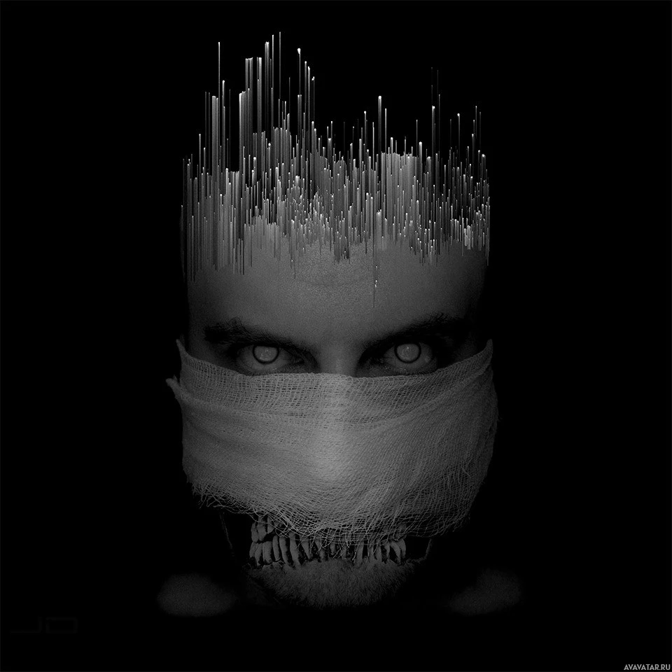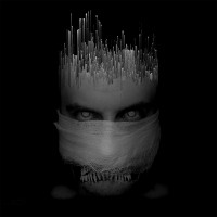 an abstract design of vertical lines below it. The overall tone of the image is eerie and reminiscent of horror themes due to the mask and the visual elements present.