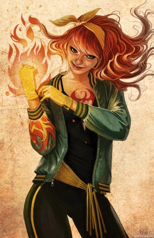 an illustrated character who appears to be a red-haired girl with fire motifs. She has a flame on her forehead, suggesting she may have powers related to fire or is associated with the element in some way. Her outfit includes elements like flames and possibly fire-themed accessories, such as gloves, which reinforce this theme. The background appears textured, perhaps resembling paper or