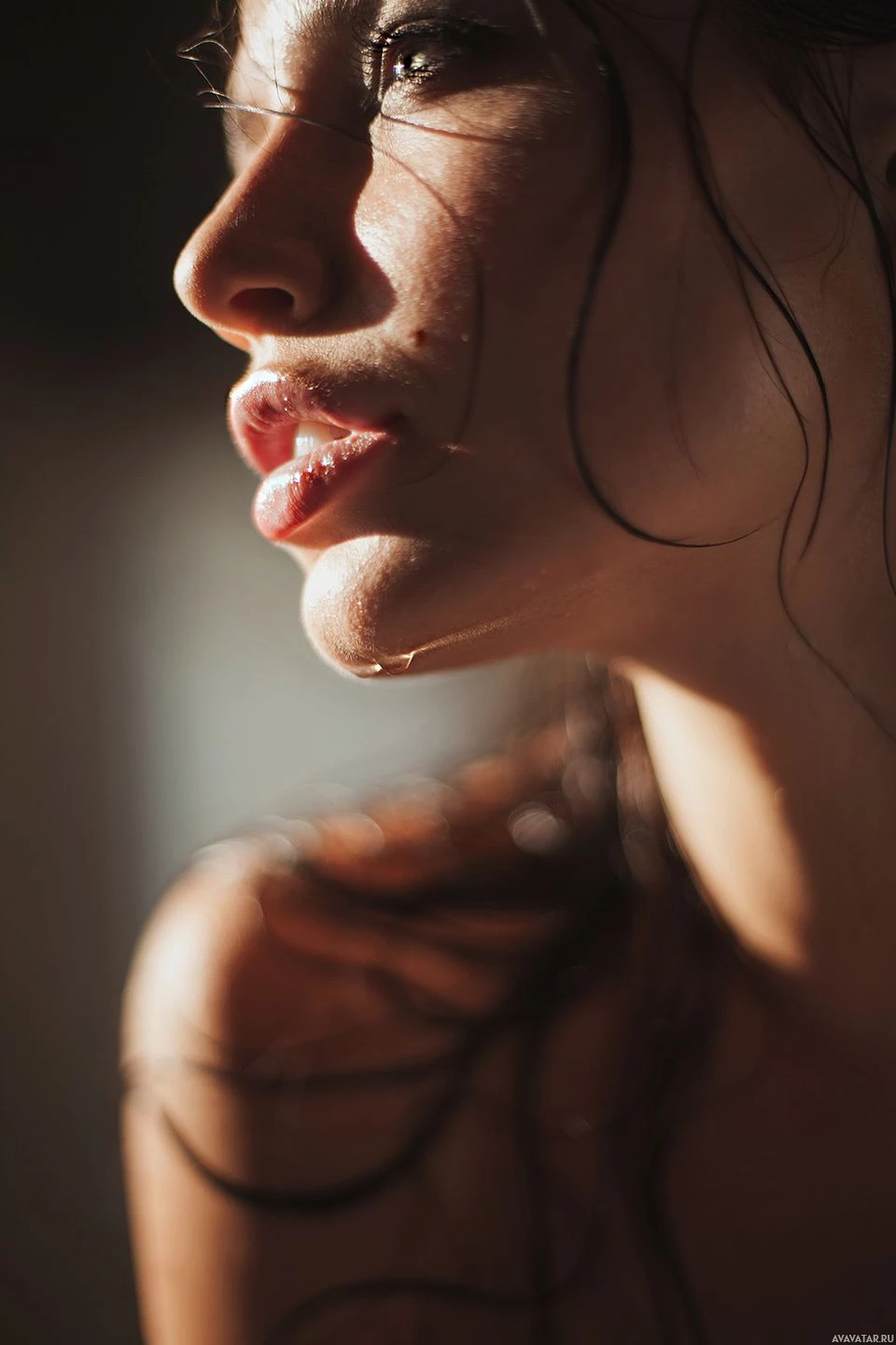 На картинке изображена женщина с мокрыми волосами и закрытыми глазами. Ее выражение лица, по-видимому, является выражением концентрации или созерцания, и у нее, кажется, капает вода из волос на плечо.