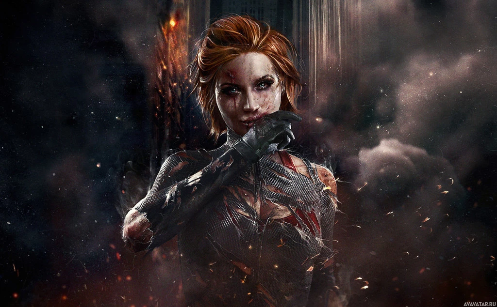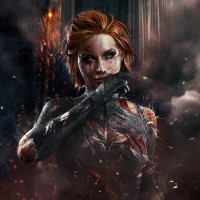 an intense expression on her face and seems to be in a stylized setting that could suggest a futuristic or battle environment. The background includes dark, dramatic elements like smoke or explosions, enhancing