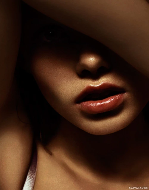 dark hair and is wearing what appears to be a pink or light brown top. Her expression is neutral, and she seems to be looking off to the side rather than directly at the viewer. Her skin looks soft, and she's showing the slightest hint of her lips with her mouth open in