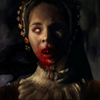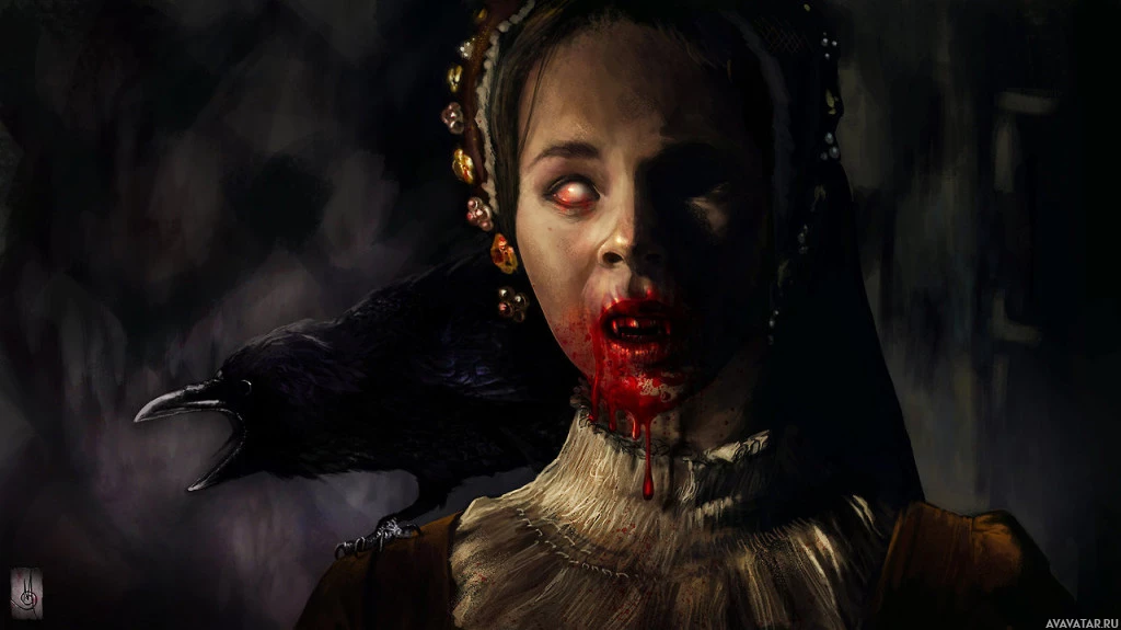 cultural symbolism. The overall atmosphere of the image suggests a vampire-related story or theme due to the supernatural elements present, such as the blood on the woman's face and the presence of a raven, which might imply a connection to