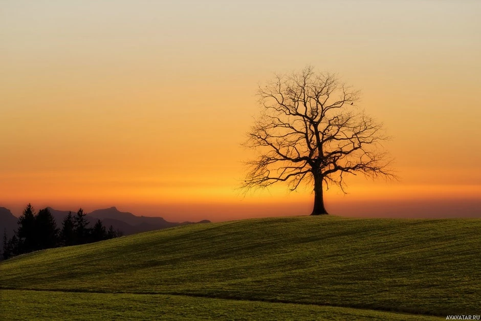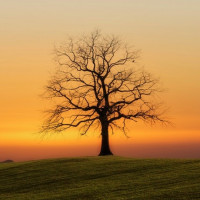 bare branches, silhouetted against the setting sunlight. Behind the tree, the sky is painted in