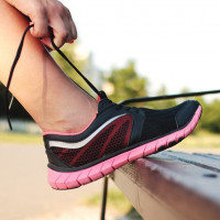 running shoes, with a distinctive pink lace loop that is often associated with certain athletic brands. It appears to be