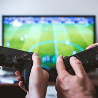 game controllers and interacting with a flat-screen TV. On the screen, there is a scene from a football (soccer) match. It appears that the players are engaged in a multiplayer video