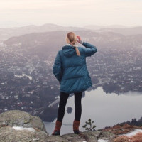 a rocky outcrop with their back to the camera. They appear to be looking at a scenic view that includes mountains and what could be