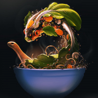an artistic twist. It appears to be a whimsical representation where ingredients like vegetables and possibly fruits are arranged in such a way that they form a fish-like shape, with the leaves as fins, seeds or grains for eyes, and perhaps some other ingredients representing a tail or body parts. The