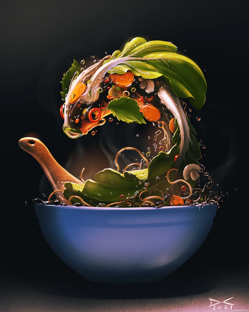 food items are vividly colored and detailed, suggesting that this is a creative and imaginative depiction rather than a realistic one.
